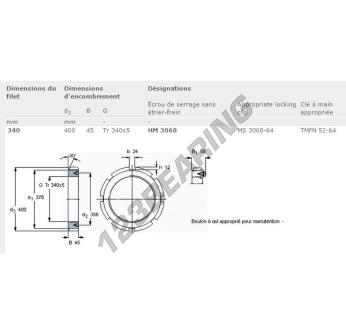 Ta nakrętka HM3068-SKF posiada średnicę wewnętrzną 340 mm, średnicę zewnętrzną 400 mm oraz grubość 45 mm.