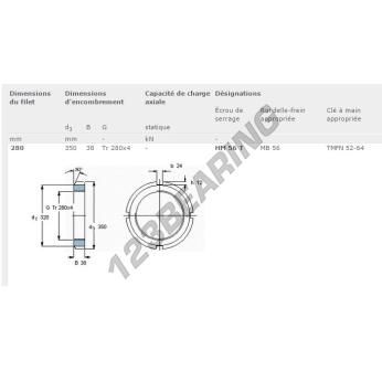 Ta nakrętka HM56T-SKF posiada średnicę wewnętrzną 280 mm, średnicę zewnętrzną 350 mm oraz grubość 38 mm.