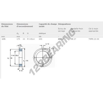 Ta nakrętka KM27-SKF posiada średnicę wewnętrzną 135 mm, średnicę zewnętrzną 175 mm oraz grubość 22 mm.
