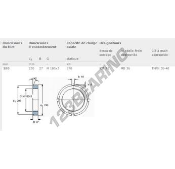 Ta nakrętka KM36-SKF posiada średnicę wewnętrzną 180 mm, średnicę zewnętrzną 230 mm oraz grubość 27 mm.