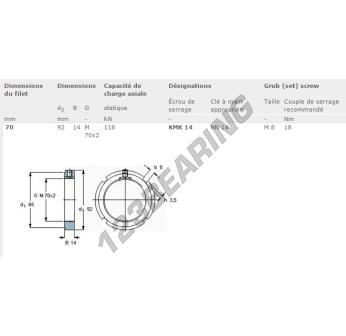 Ta nakrętka KMK14-SKF posiada średnicę wewnętrzną 70 mm, średnicę zewnętrzną 92 mm oraz grubość 14 mm.