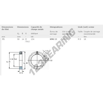 Ta nakrętka KMK15-SKF posiada średnicę wewnętrzną 75 mm, średnicę zewnętrzną 98 mm oraz grubość 14 mm.