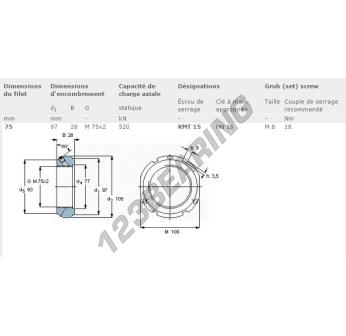 Ta nakrętka KMT15-SKF posiada średnicę wewnętrzną 75 mm, średnicę zewnętrzną 97 mm oraz grubość 28 mm.