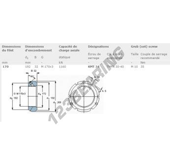 Ta nakrętka KMT34-SKF posiada średnicę wewnętrzną 170 mm, średnicę zewnętrzną 192 mm oraz grubość 32 mm.