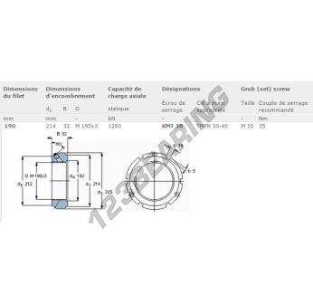 Ta nakrętka KMT38-SKF posiada średnicę wewnętrzną 190 mm, średnicę zewnętrzną 214 mm oraz grubość 32 mm.
