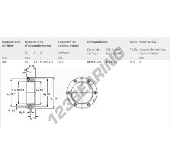 Ta nakrętka KMTA10-SKF posiada średnicę wewnętrzną 50 mm, średnicę zewnętrzną 63 mm oraz grubość 24 mm.