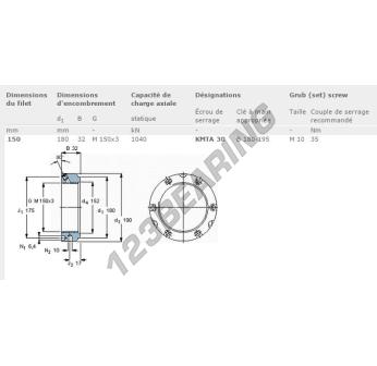 Ta nakrętka KMTA30-SKF posiada średnicę wewnętrzną 150 mm, średnicę zewnętrzną 180 mm oraz grubość 32 mm.