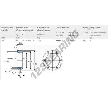 Ta nakrętka KMTA9-SKF posiada średnicę wewnętrzną 45 mm, średnicę zewnętrzną 58 mm oraz grubość 22 mm.