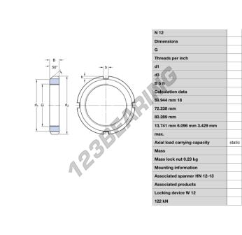 Ta nakrętka N12-SKF posiada średnicę wewnętrzną 59.944 mm, średnicę zewnętrzną 80.289 mm oraz grubość 13.741 mm.
