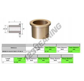Tuleja Z Brązu Z Kołnierzem o numerze referencyjnym BFAI38.10-44.45-47.625-3.175-38.10 posiada średnicę wewnętrzną 38.1 mm, średnicę zewnętrzną 44.45 mm oraz długość 38.1 mm.