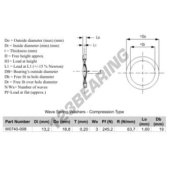 Podkładka Falista – Typ ściskany o numerze referencyjnym W0740008 posiada średnicę wewnętrzną 13.2 mm, średnicę zewnętrzną 18.8 mm oraz grubość 0.2 mm. Jest wykonana z materiału STAL