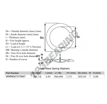 Podkładka Sprężynująca Falista Dzielona o numerze referencyjnym SWSW-205-184.16-0.81-7 posiada średnicę wewnętrzną 184.16 mm oraz grubość 0.81 mm. Jest wykonana z materiału STAL.