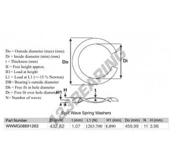Podkładka Sprężynująca Falista Dzielona o numerze referencyjnym SWSW-459.99-432.82-1.07-11 posiada średnicę wewnętrzną 432.82 mm oraz grubość 1.07 mm. Jest wykonana z materiału STAL.
