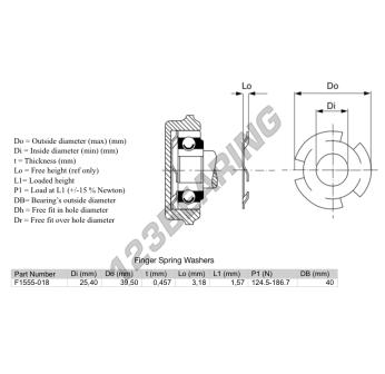 La Podkładka Sprężynująca Palcowa o numerze referencyjnym F1555-018 posiada średnicę wewnętrzną 25.4 mm, średnicę zewnętrzną 39.5 mm oraz grubość 0.457 mm.