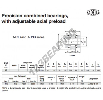 Inne łożyska, znany pod numerem referencyjnym ARNB45120-NADELLA NADELLA, posiada średnicę wewnętrzną 45 mm, średnicę zewnętrzną 105 mm oraz grubość 82 mm.