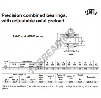 Inne łożyska, znany pod numerem referencyjnym ARNB55130-NADELLA NADELLA, posiada średnicę wewnętrzną 55 mm, średnicę zewnętrzną 115 mm oraz grubość 82 mm.