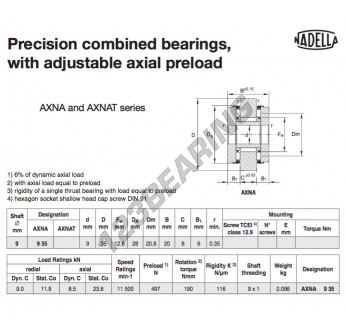 Inne łożyska, znany pod numerem referencyjnym AXNA935-NADELLA NADELLA, posiada średnicę wewnętrzną 9 mm, średnicę zewnętrzną 28 mm oraz grubość 20 mm.