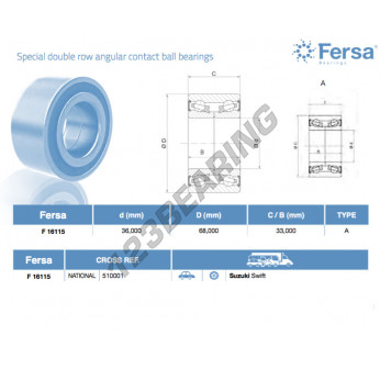 Łożysko Koła F16115-ASFERSA, Średnica wewnętrzna 36 mm, Średnica zewnętrzna 68 mm, Grubość 33 mm