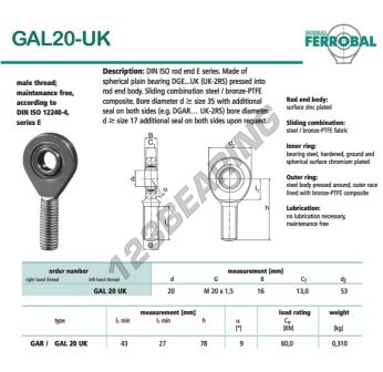 Główki Cięgieł Sa, znana pod numerem referencyjnym GAL20-UK-DURBAL, marki DURBAL, posiada gwint o skoku oraz Gwint lewy, średnicę wewnętrzną 20 mm, średnicę zewnętrzną 53 mm oraz grubość 16 mm.