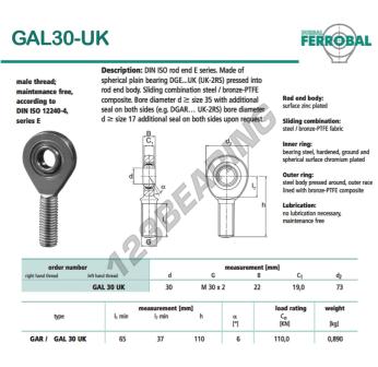 Główki Cięgieł Sa, znana pod numerem referencyjnym GAL30-UK-DURBAL, marki DURBAL, posiada gwint o skoku oraz Gwint lewy, średnicę wewnętrzną 30 mm, średnicę zewnętrzną 73 mm oraz grubość 22 mm.