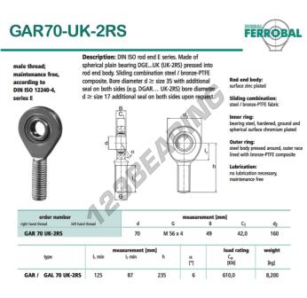 Główki Cięgieł Sa, znana pod numerem referencyjnym GAR70-UK-2RS-DURBAL, marki DURBAL, posiada gwint o skoku oraz Gwint prawy, średnicę wewnętrzną 70 mm, średnicę zewnętrzną 160 mm oraz grubość 49 mm.