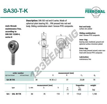 Główki Cięgieł Sa, znana pod numerem referencyjnym SA30-T-K-DURBAL, marki DURBAL, posiada gwint o skoku oraz Gwint prawy, średnicę wewnętrzną 30 mm, średnicę zewnętrzną 70 mm oraz grubość 37 mm.