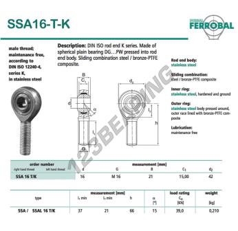 Główki Cięgieł Sa, znana pod numerem referencyjnym SSA16-T-K-DURBAL, marki DURBAL, posiada gwint o skoku oraz Gwint prawy, średnicę wewnętrzną 16 mm, średnicę zewnętrzną 42 mm oraz grubość 21 mm.