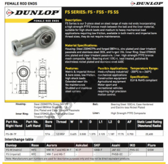Główki Cięgieł Si, znana pod numerem referencyjnym FSL-08-7-F-DUNLOP, marki DUNLOP, posiada średnicę wewnętrzną 11.11 mm, średnicę zewnętrzną 0.625 mm oraz grubość 0.5 mm.