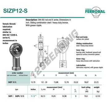 Główki Cięgieł Si, znana pod numerem referencyjnym SIZP12-S-DURBAL, marki DURBAL, posiada średnicę wewnętrzną 12.7 mm, średnicę zewnętrzną 33.32 mm oraz grubość 15.88 mm.