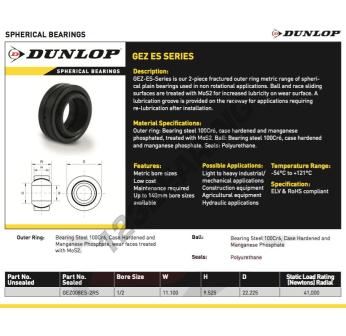Łożyska Przegubowe Ge, znana pod numerem referencyjnym GEZ008-ES-2RS-DUNLOP, marki DUNLOP, posiada średnicę wewnętrzną 12.7 mm, średnicę zewnętrzną 22.225 mm oraz grubość 11.1 mm.