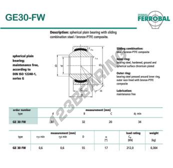 Łożysko Przegubowe Geew o numerze referencyjnym GE30-FW-DURBAL, marki DURBAL, posiada średnicę wewnętrzną 30 mm, średnicę zewnętrzną 55 mm oraz grubość 20 mm.