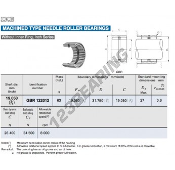 Łożysko Igiełkowe, znany pod numerem referencyjnym GBR122012-IKO, marki IKO, posiada średnicę wewnętrzną 19.05 mm, średnicę zewnętrzną 31.75 mm oraz grubość 19.05 mm.