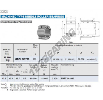 Łożysko Igiełkowe, znany pod numerem referencyjnym GBRI243720-IKO, marki IKO, posiada średnicę wewnętrzną 38.1 mm, średnicę zewnętrzną 58.738 mm oraz grubość 32 mm.