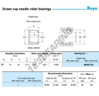 Łożysko Igiełkowe, znany pod numerem referencyjnym MKM3730-JTEKT, marki JTEKT, posiada średnicę wewnętrzną 37 mm, średnicę zewnętrzną 47 mm oraz grubość 30 mm.