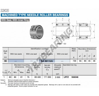 Łożysko Igiełkowe, znany pod numerem referencyjnym NA6911-UU-IKO, marki IKO, posiada średnicę wewnętrzną 55 mm, średnicę zewnętrzną 80 mm oraz grubość 46 mm.