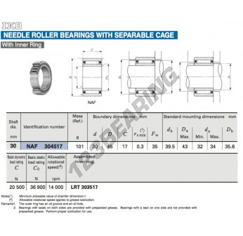 Łożysko Igiełkowe, znany pod numerem referencyjnym NAF304517-IKO, marki IKO, posiada średnicę wewnętrzną 30 mm, średnicę zewnętrzną 45 mm oraz grubość 17 mm.