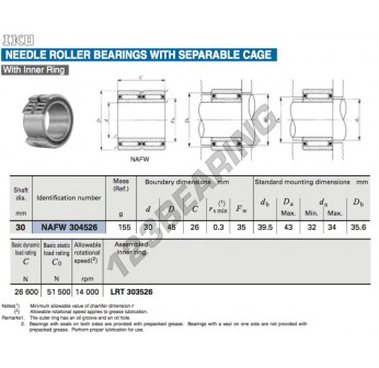 Łożysko Igiełkowe, znany pod numerem referencyjnym NAFW304526-IKO, marki IKO, posiada średnicę wewnętrzną 30 mm, średnicę zewnętrzną 45 mm oraz grubość 26 mm.
