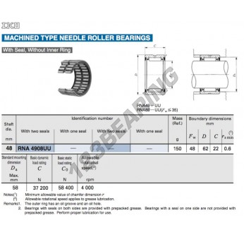 Łożysko Igiełkowe, znany pod numerem referencyjnym RNA4908-UU-IKO, marki IKO, posiada średnicę wewnętrzną 48 mm, średnicę zewnętrzną 62 mm oraz grubość 22 mm.