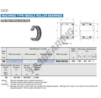 Łożysko Igiełkowe, znany pod numerem referencyjnym RNA6912-U-IKO, marki IKO, posiada średnicę wewnętrzną 68 mm, średnicę zewnętrzną 85 mm oraz grubość 45 mm.