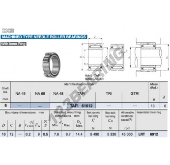 Łożysko Igiełkowe, znany pod numerem referencyjnym TAFI61612-IKO, marki IKO, posiada średnicę wewnętrzną 6 mm, średnicę zewnętrzną 16 mm oraz grubość 12 mm.