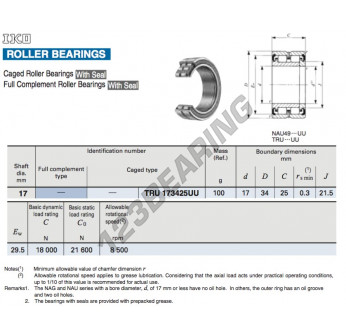 Łożysko Igiełkowe, znany pod numerem referencyjnym TRU173425-UU-IKO, marki IKO, posiada średnicę wewnętrzną 17 mm, średnicę zewnętrzną 34 mm oraz grubość 25 mm.
