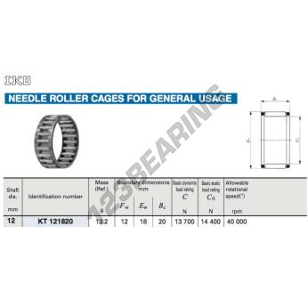 Koszyk Igiełkowy, znana pod numerem referencyjnym KT121820C3-IKO, marki IKO, posiada średnicę wewnętrzną 12 mm, średnicę zewnętrzną 18 mm oraz grubość 20 mm.