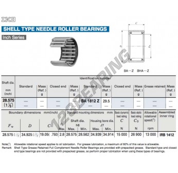 Łożysko Igiełkowe Typ Hk, znana pod numerem referencyjnym BA1812-ZOH-IKO, marki IKO, posiada średnicę wewnętrzną 28.58 mm, średnicę zewnętrzną 34.93 mm oraz grubość 19.05 mm.