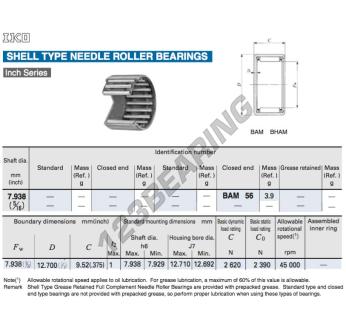 Łożysko Igiełkowe Typ Hk, znana pod numerem referencyjnym BAM56-IKO, marki IKO, posiada średnicę wewnętrzną 7.94 mm, średnicę zewnętrzną 12.7 mm oraz grubość 9.52 mm.