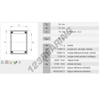 Łożysko Igiełkowe Typ Hk, znana pod numerem referencyjnym HK3016-B-INA, marki INA, posiada średnicę wewnętrzną 30 mm, średnicę zewnętrzną 37 mm oraz grubość 16 mm.
