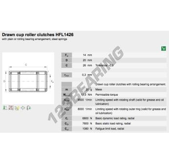 Sprzęgło Igiełkowe Jednokierunkowe, znana pod numerem referencyjnym HFL1426-L564-INA, marki INA, posiada średnicę wewnętrzną 14 mm, średnicę zewnętrzną 20 mm oraz grubość 26 mm.