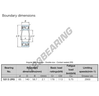 Łożysko Kulkowe, znane jako 5313-2RS-JTEKT JTEKT, ma średnicę wewnętrzną 65mm, średnicę zewnętrzną 140mm i grubość 58.7mm.