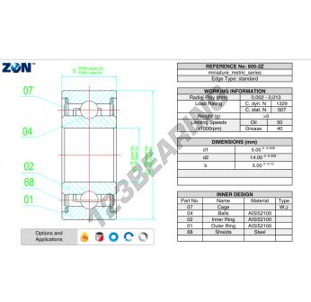 Łożysko Kulkowe, znane jako 605-2Z-ZEN ZEN, ma średnicę wewnętrzną 5mm, średnicę zewnętrzną 14mm i grubość 5mm.