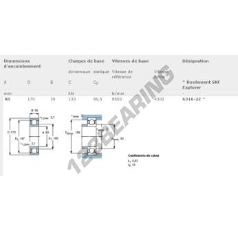 Łożysko Kulkowe, znane jako 6316-ZZ-SKF SKF, ma średnicę wewnętrzną 80mm, średnicę zewnętrzną 170mm i grubość 39mm.