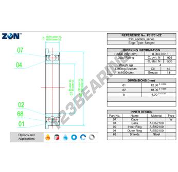 Łożysko Kulkowe, znane jako F61701-ZZ-ZEN ZEN, ma średnicę wewnętrzną 12mm, średnicę zewnętrzną 18mm i grubość 4mm.